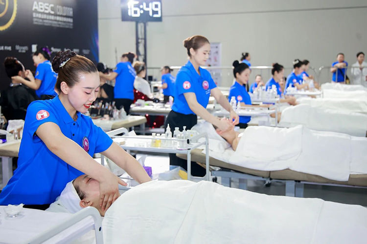 美容赛场内,山东欧曼谛选手们全神贯注,将专业知识与护理手法深度融合。他们为模特进行系统的面部清洁、专业护理和舒缓按摩,以规范的操作流程和细致入微的呵护,为模特的肌肤带来全方位的焕新体验,展现出美容专业的严谨与专业。